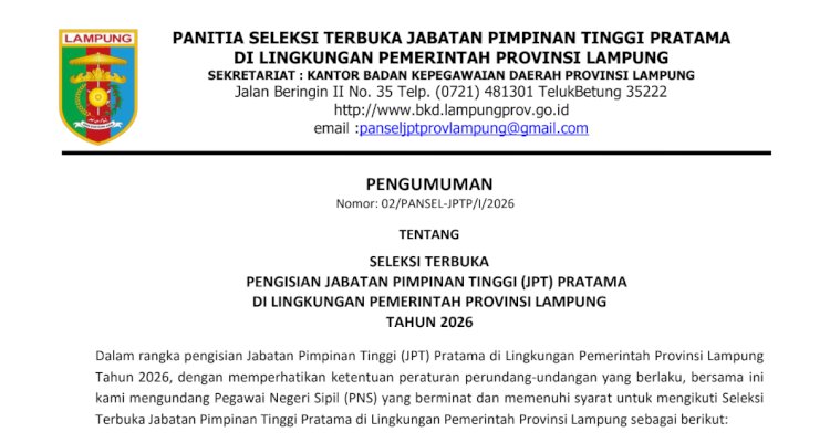 Pemprov Lampung Buka Seleksi Terbuka Kepala Dinas Perindustrian dan Perdagangan