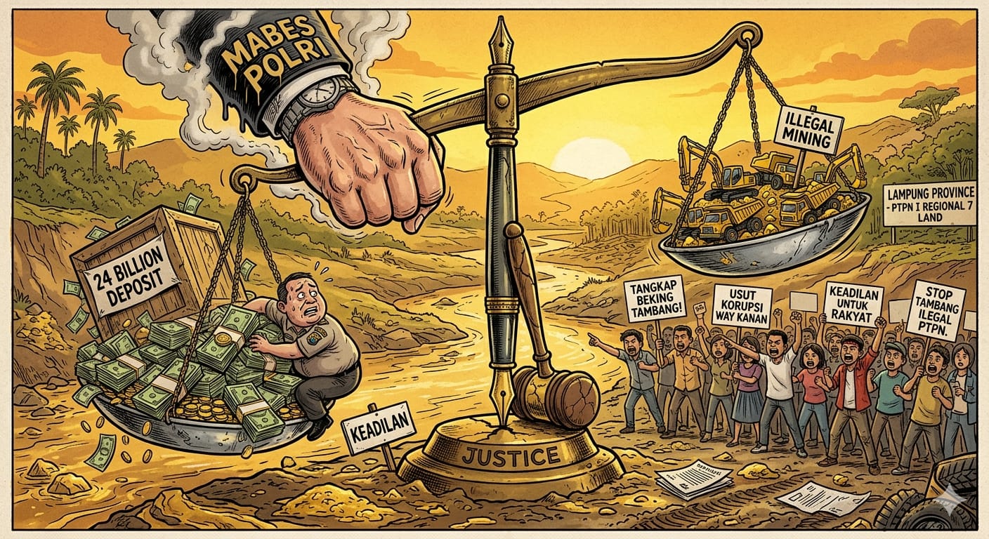 JAKARTA – Penindakan praktik Pertambangan Emas Tanpa Izin (PETI) di lahan PTPN I Regional 7, Kabupaten Way Kanan, dinilai menjadi fenomena “puncak gunung es” dari carut-marutnya pengawasan hukum di Provinsi Lampung, Naasnya tambang tersebut berada di belakang kantor polres waykanan Skandal ini kini memasuki babak baru dengan munculnya desakan agar Mabes Polri mengusut tuntas keterlibatan oknum aparat yang diduga menjadi pelindung operasional tambang selama 1,5 tahun terakhir.